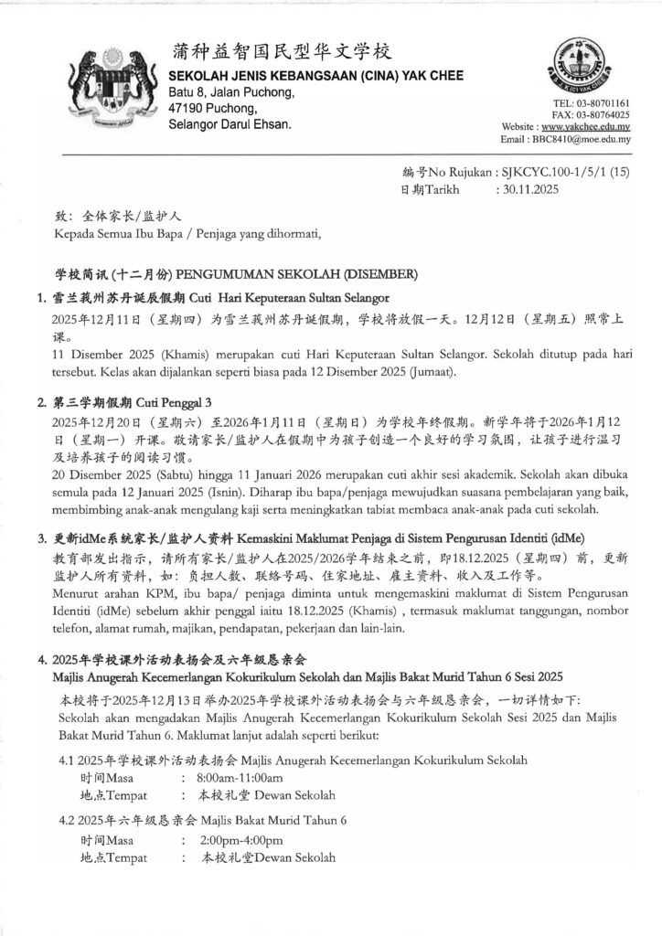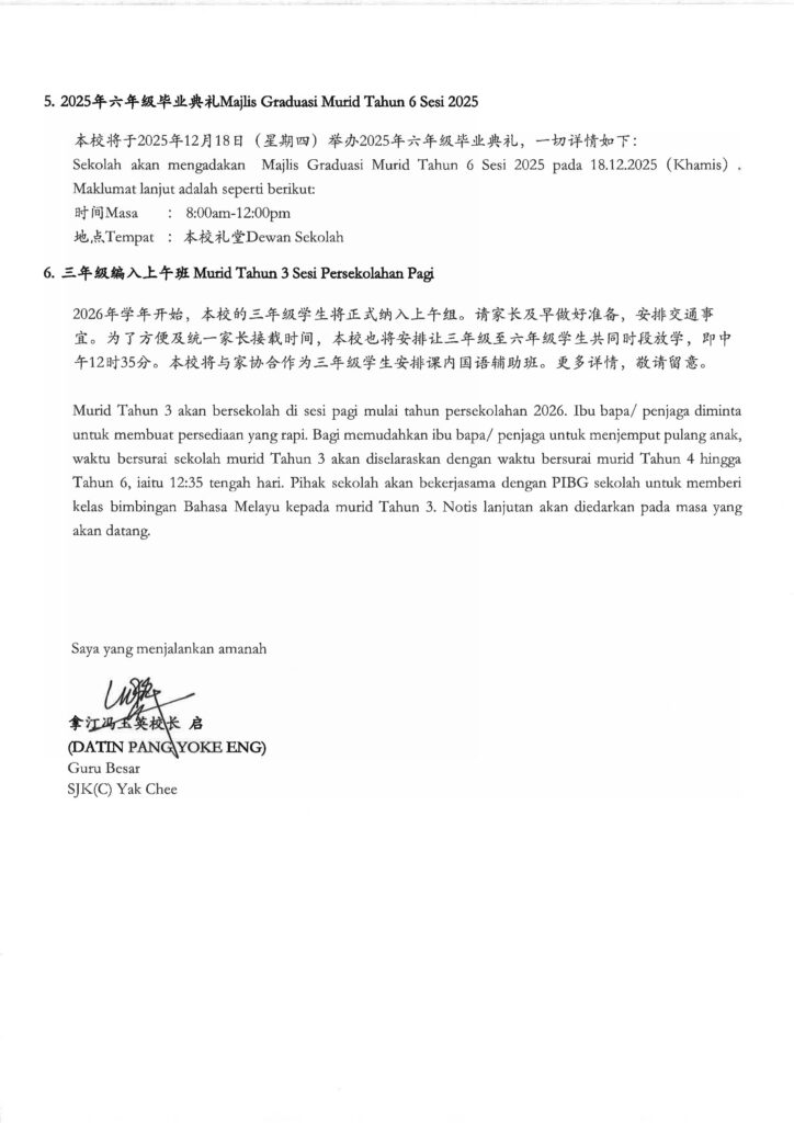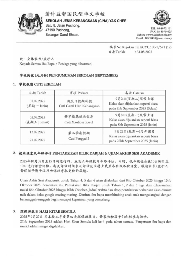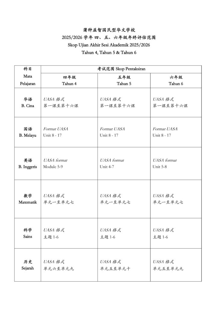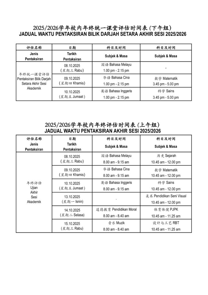 Posted on 08/09/20252025/2026学年校内年终统一课堂评估时间表及评估范围 JADUAL WAKTU PENTAKSIRAN BILIK DARJAH SETARA AKHIR SESI 2025/2026 DAN SKOP UJIAN